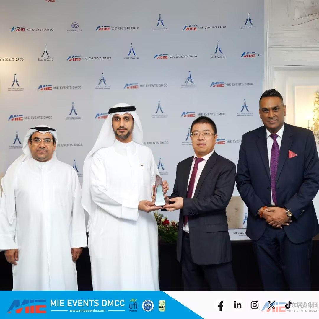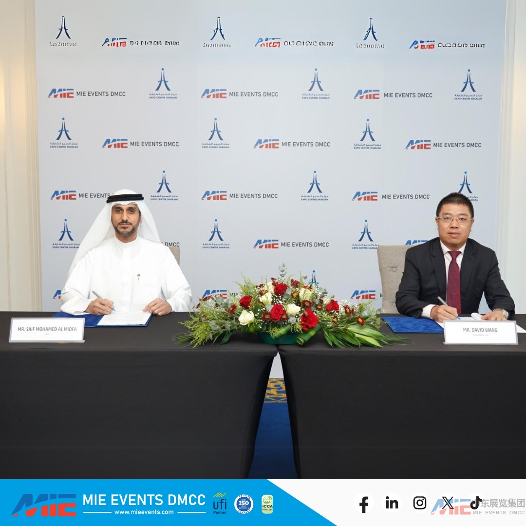 签约仪式于2024年6月10日在沙迦博览中心举行,沙迦博览中心首席执行官 Saif Mohamed Al-Midfa 阁下和中东国际展览集团董事长兼首席执行官王海林David Wang先生以及双方的相关人员出席了仪式。