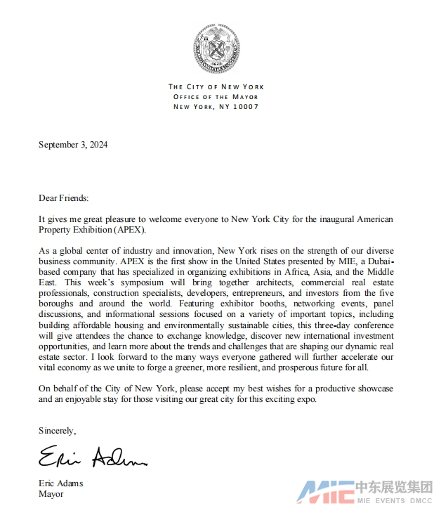 更值得一提的是,纽约市政府对APEX 2024给予了高度重视和热烈支持。市长亲自发来欢迎函,对即将举办的博览会的举办表示诚挚的期待,并希望APEX 2024能够为纽约市的房地产行业发展注入新的活力。